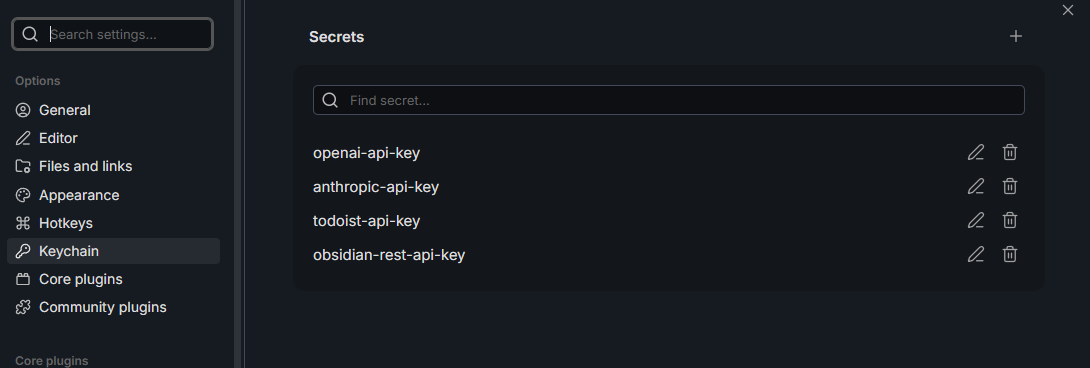 openai-api-key- Used by Copilot, Smart Connectionsanthropic-api-key- Used by Copilottodoist-api-key- Used by Todoist Syncobsidian-rest-api-key- Used by Local REST API